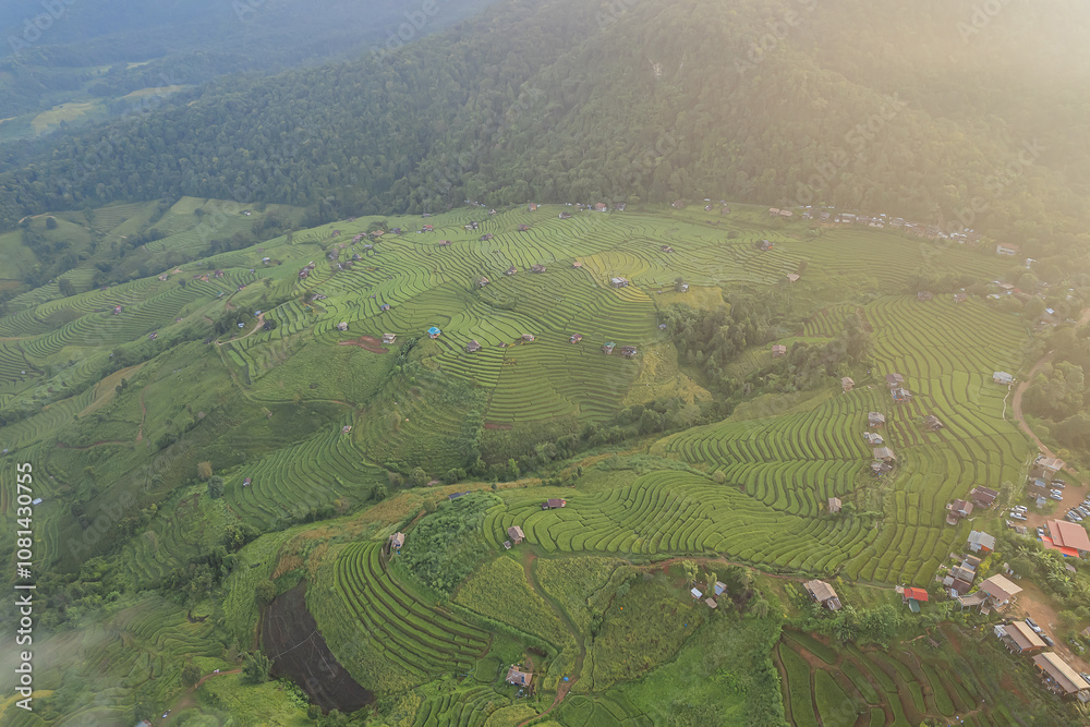 Beautiful aerial view of rice terraces at sunrise in during the rainy season at Ban Pa Pong Piang, Chiang Mai, Thailand.