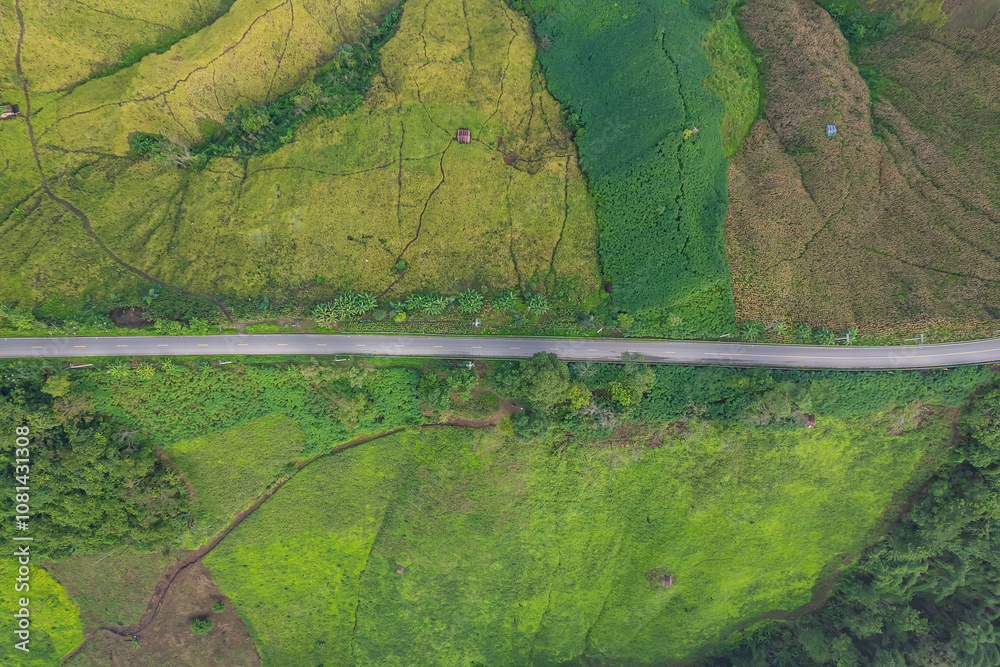Aerial view in the morning of a road through a lush green forest leading to a rural village.