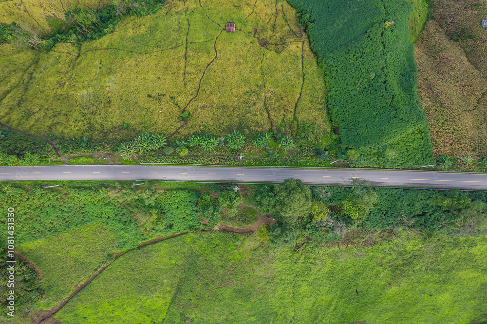 Aerial view in the morning of a road through a lush green forest leading to a rural village.