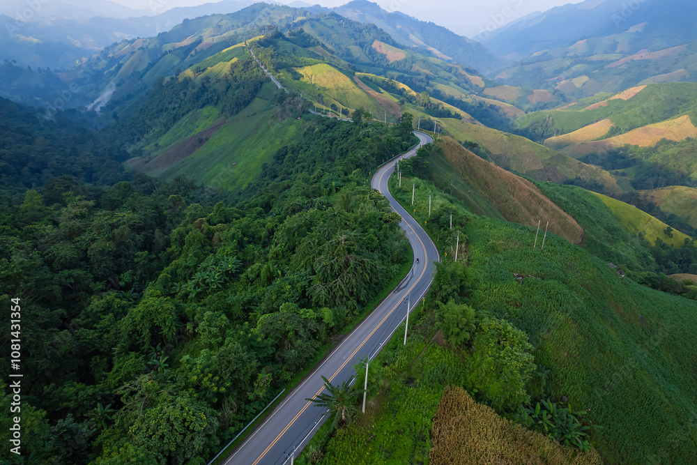 Aerial view in the morning of a road through a lush green forest leading to a rural village.