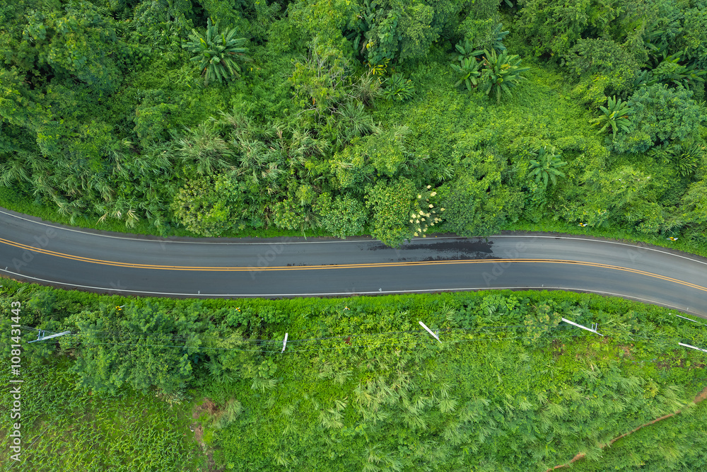 Aerial view of countryside road passing through the green forest and mountain in Thailand.