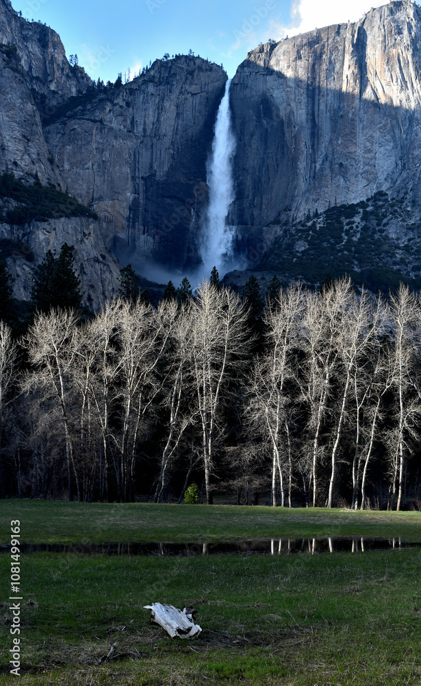 Yosemite Falls and bare Aspen trees in winter. Yosemite National Park, California.
