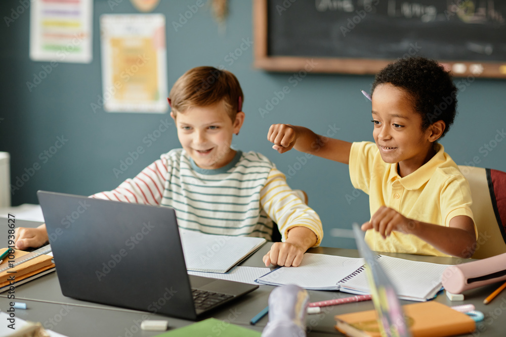 Candid shot of young excited Black boy watching video on laptop together with classmate while having fun studying in classroom, copy space