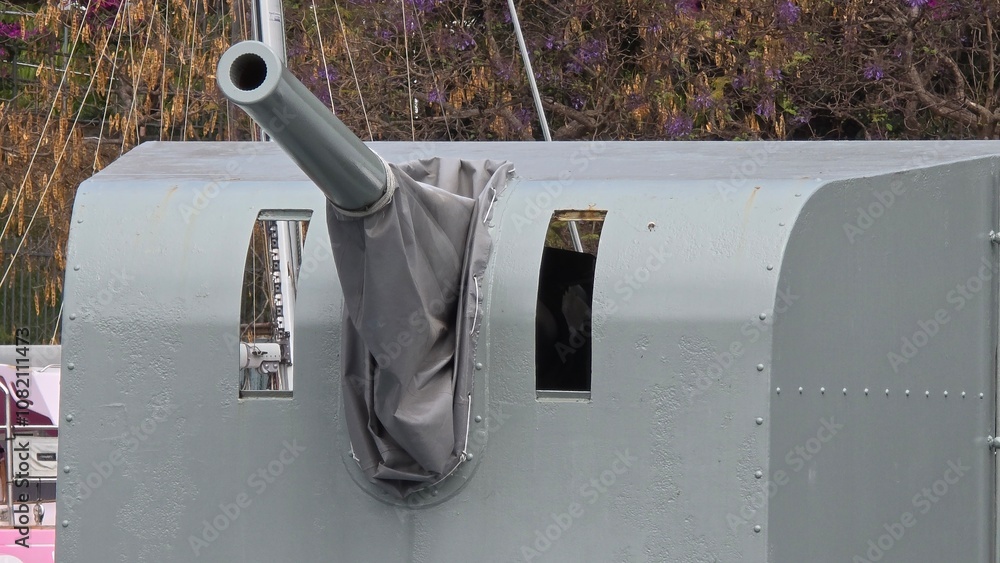 Grey WWII naval artillery gun cannon with protective metal canopy