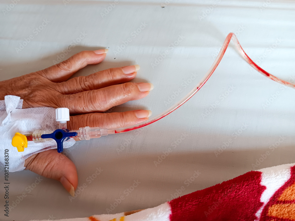 Elderly woman's hand with Saline IV and blood in an infusion set isolated on white bed sheet.