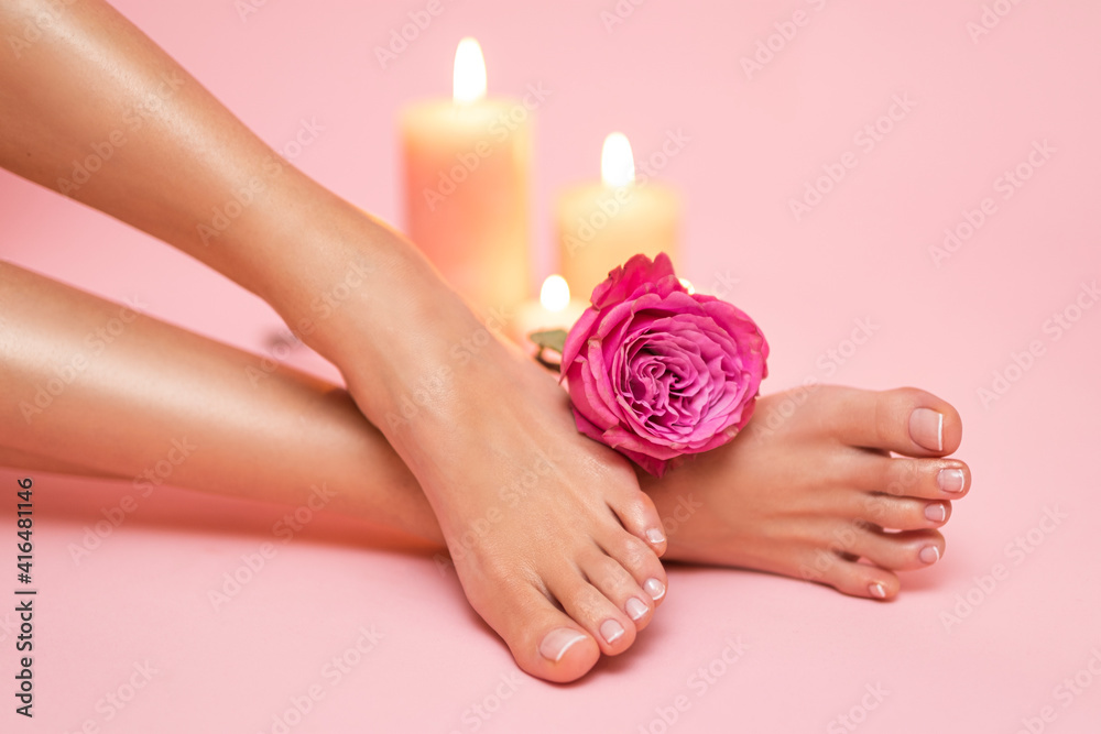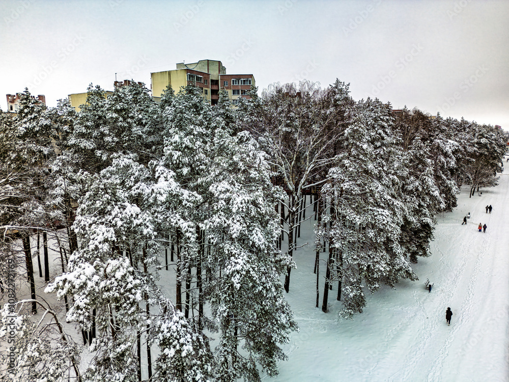 Snow-covered trees line a serene pathway in a city park during winter, with people enjoying the snowy landscape on a cloudy day