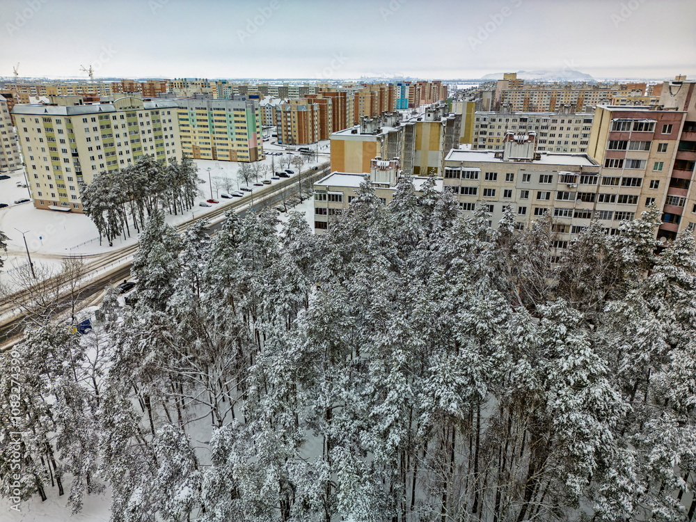 A snowy winter landscape with tall buildings and dense trees in a residential area on a cold day in a northern city