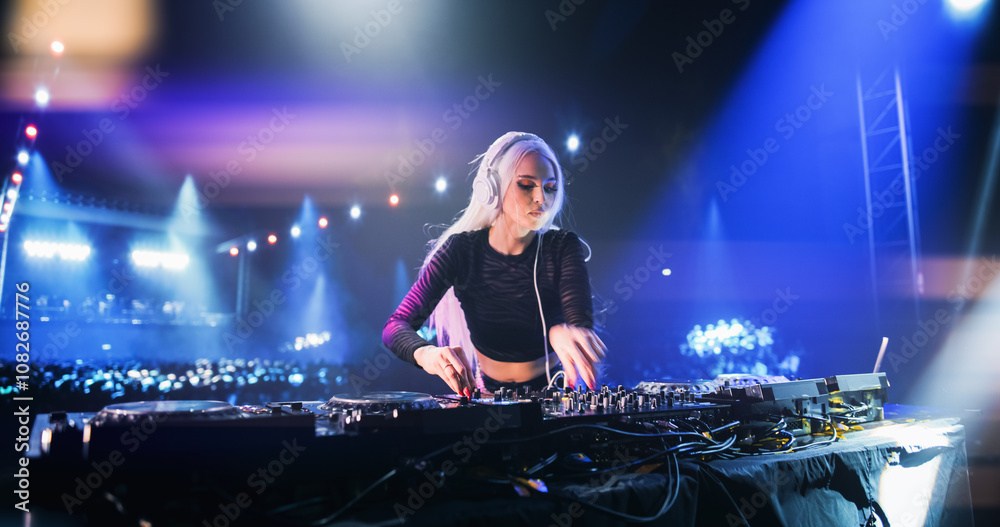 Establishing Footage with Professional DJ Equipment on a Club Stage. Mixing Decks, Controllers and Other Gear Standing on a Table, Ready to Be Used by a Popular Music Artist in Front of Audience