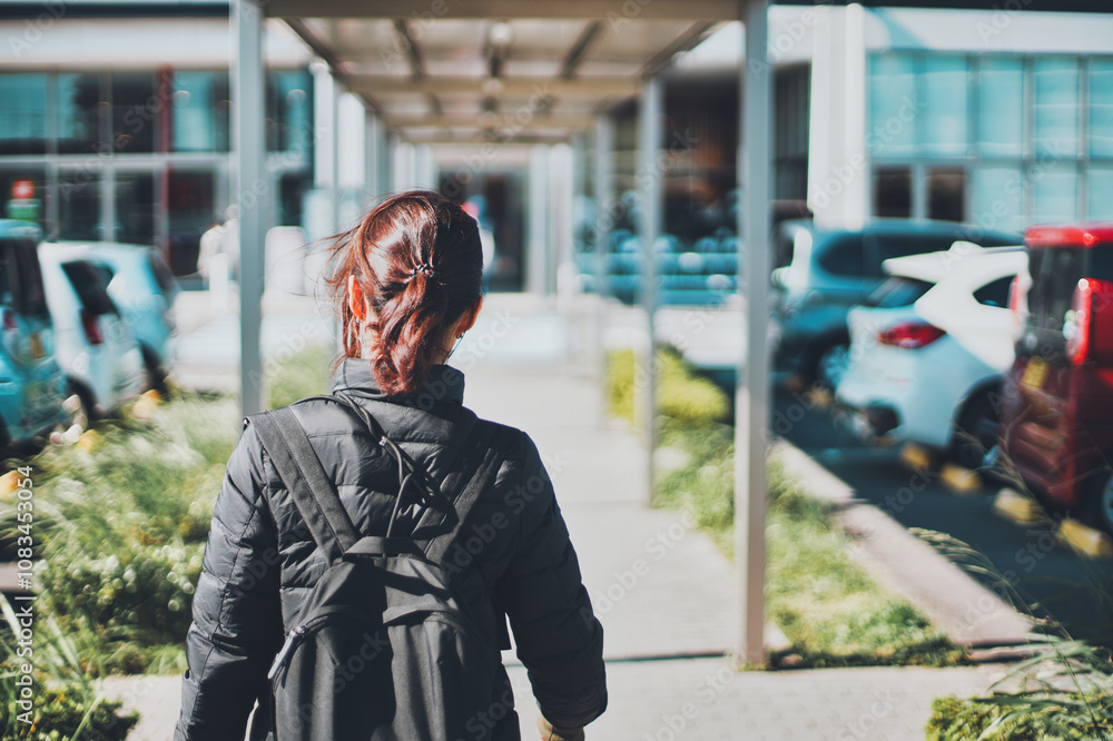 駐車場の通路を歩く女性の後ろ姿
