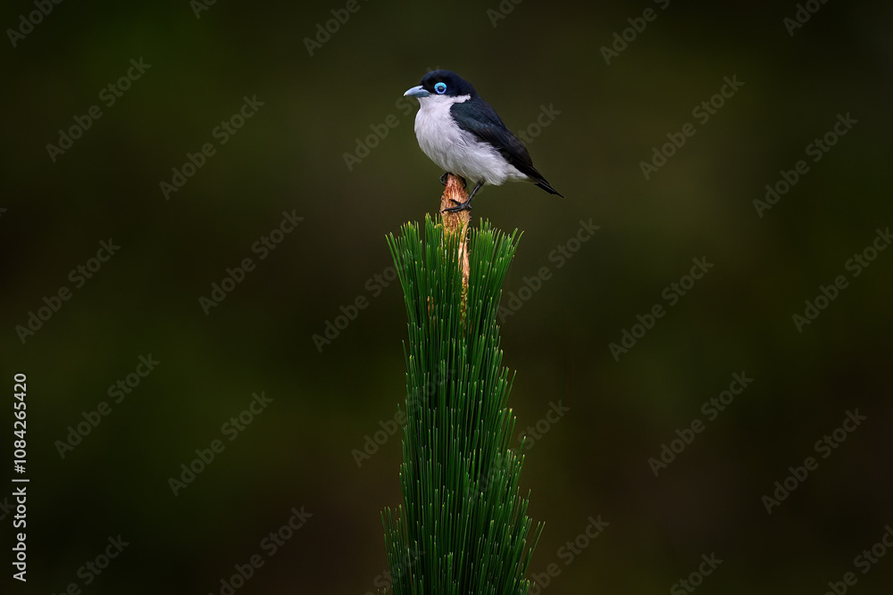Chabert Vanga, Leptopterus chabert, dark blue white bird sitting on the green pine tree in the nature habitat. Rare endemic bird from Ranomafana NP in Madagascar. Nature wildlife, animal from Africa,
