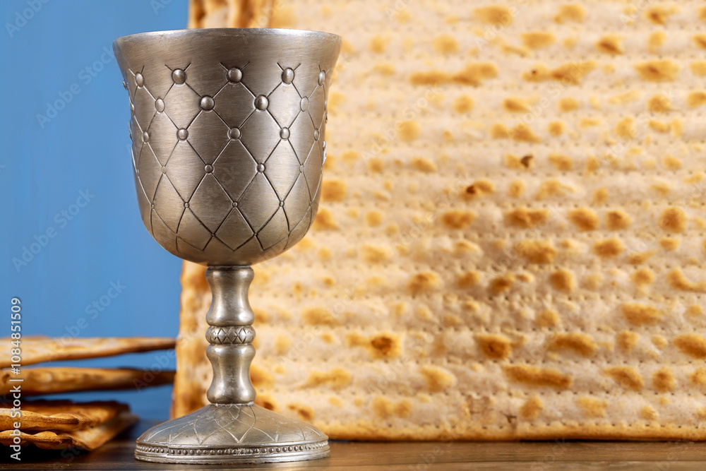 Matzah and a silver cup full of wine. Jewish holidays Passover concept.