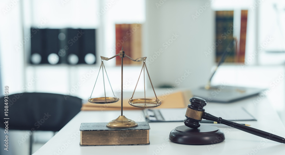 Scales of Justice: A close-up shot of a gavel, scales of justice, and a book on a lawyer's desk. The image evokes the solemnity and importance of the legal profession.