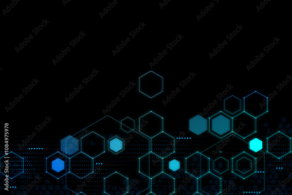 Blank dark background with space for advertising banner, campaign logo or text and digital hexagon cells grid. 3D rendering, mock up