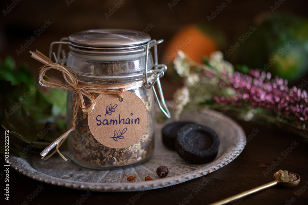 Incense mixture for Samhain in a jar (frankincense, copal, myrrh, cedarwood, rosemary). Samhain is a celtic seasonal festival marking the beginning of winter.