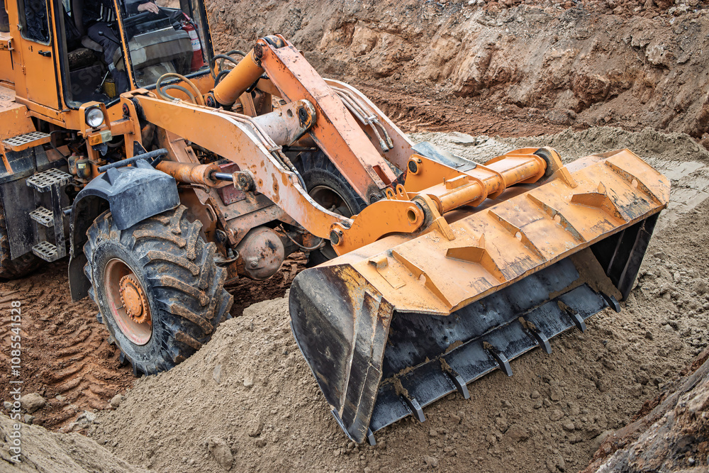Heavy machinery digs into the earth at a construction site amidst the cool morning light, showcasing industrious activity and progress