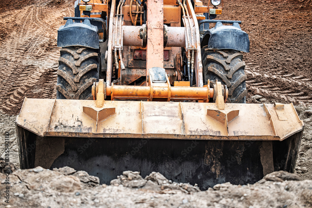 A powerful tractor digs into the earth, shaping the land at a construction site on a sunny afternoon, preparing for new developments