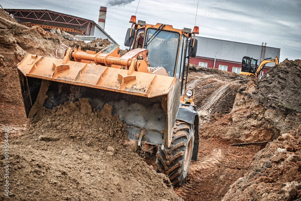 Construction machinery engaged in earthmoving at a busy site near a red barn under overcast skies, showcasing the power of heavy equipment in action