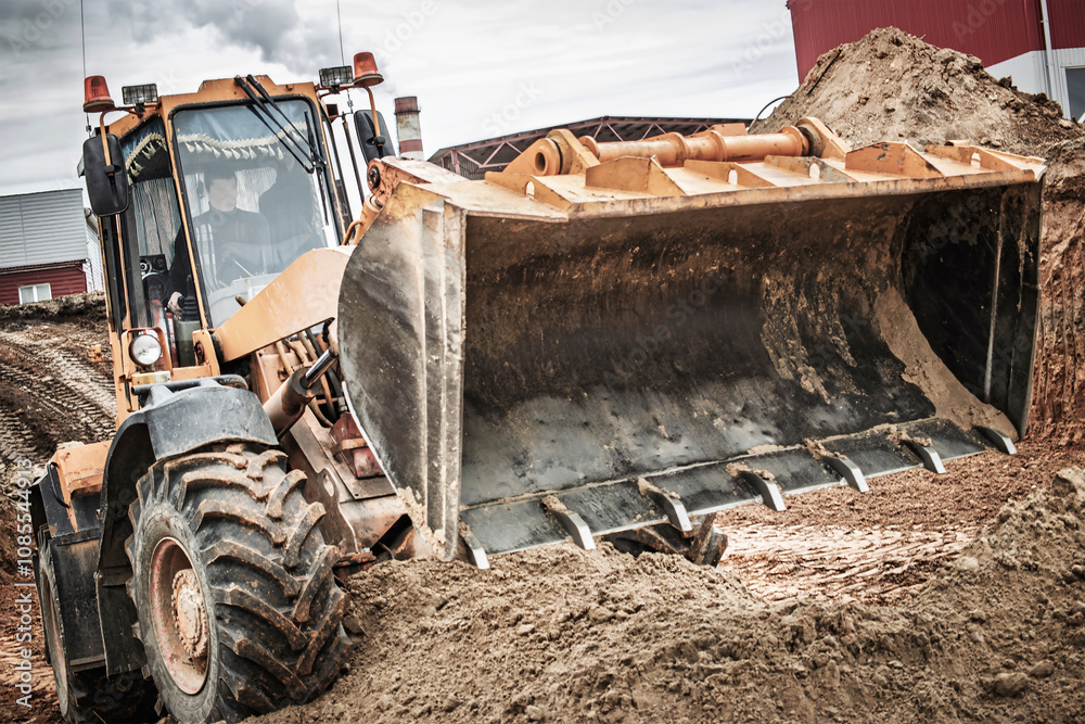 Construction equipment moves earth during a cloudy day on a rural site, preparing the ground for future development and projects