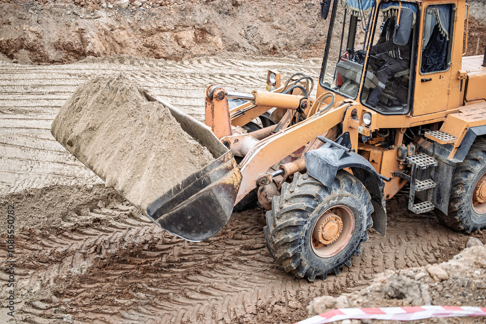 A construction site worker operates a yellow loader as it lifts sand during an excavation project on a sunny afternoon