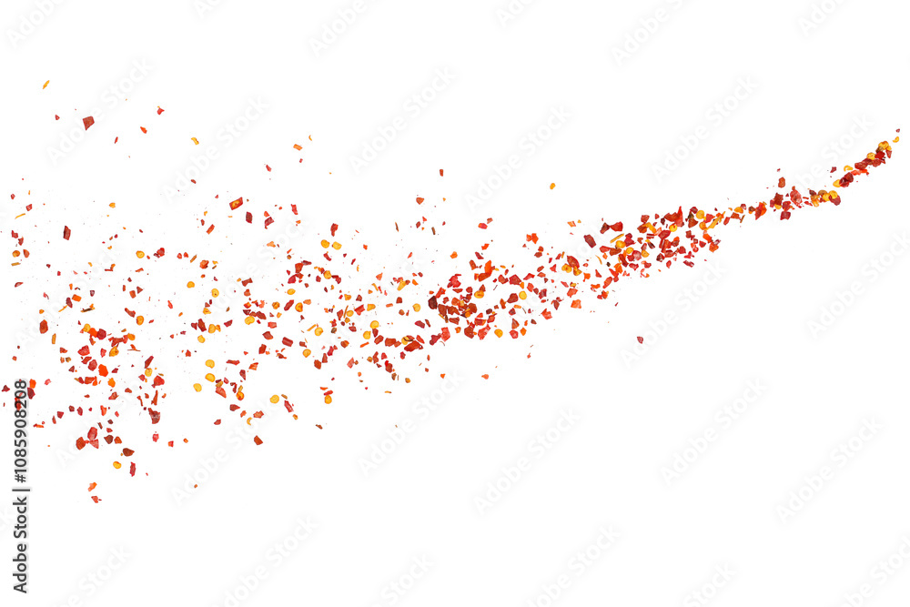 Spicy chili red pepper flakes flying, chopped, milled dry paprika pile isolated on white