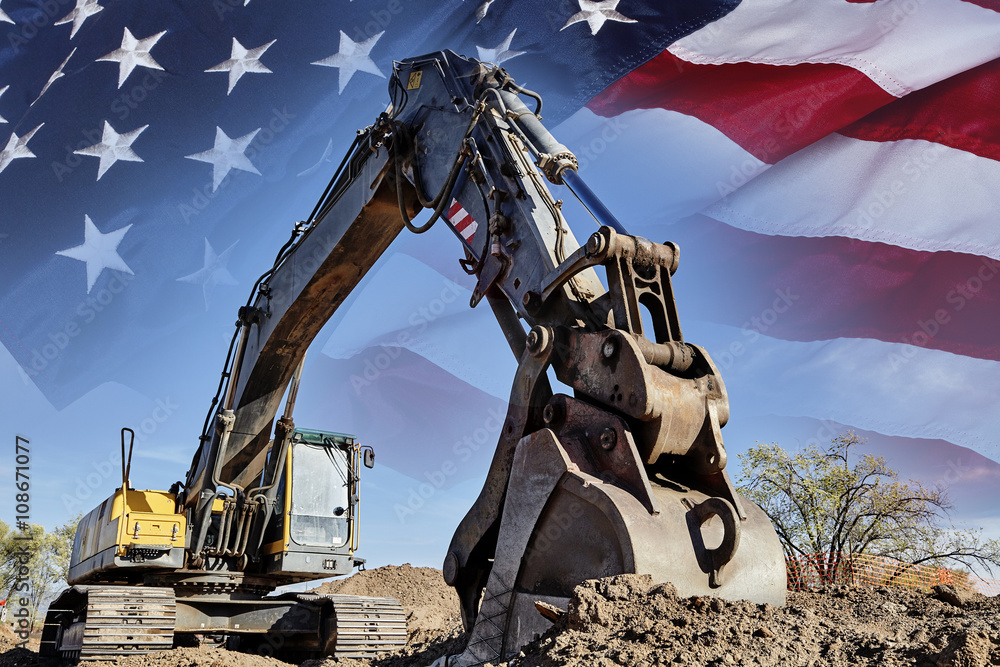 Industrial Heavy Equipment machine excavator USA flag concept bu