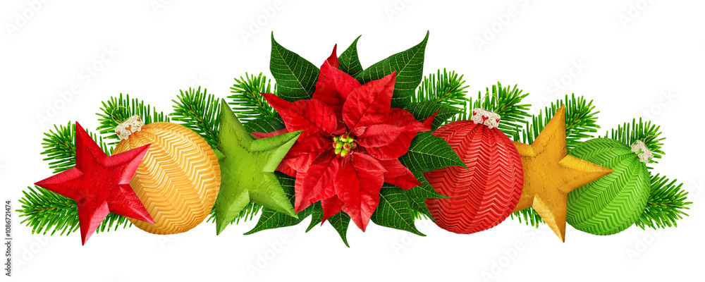 Decoration and Christmas rose with balls, stars, fir branche isolated on white background