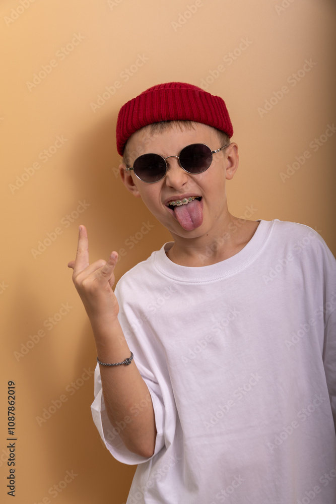 cheerful boy in a white t-shirt shows a rock gesture on a yellow isolated background