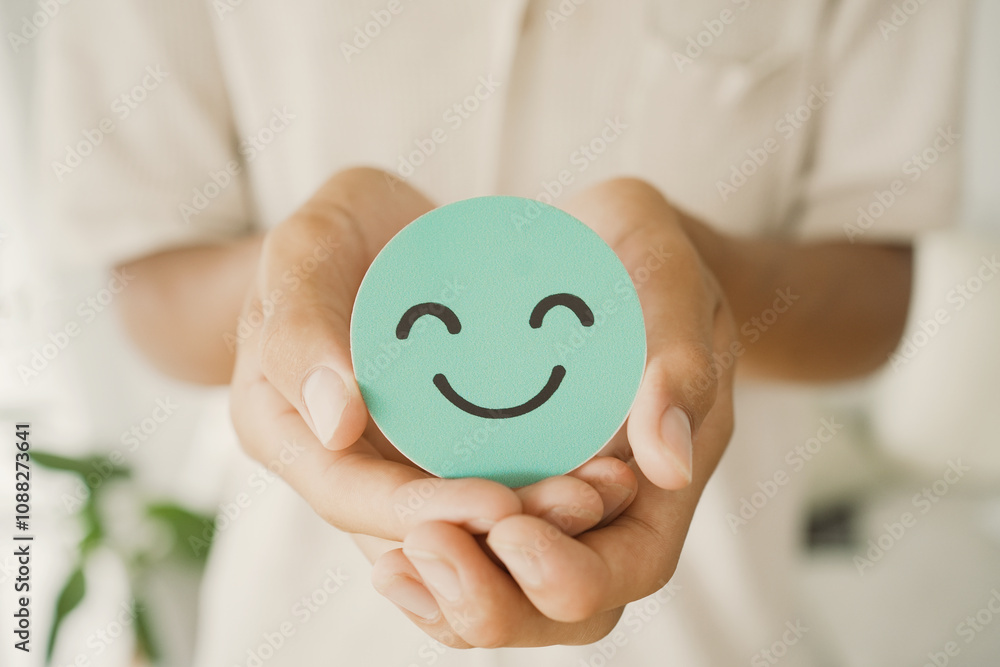 Male Teen holding smile emoji face, positive mental health, world mental health day concept