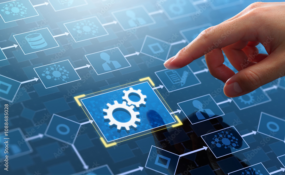 Business process automation BPA technology. Workflow system. Businessman touching gears icon on flowchart.