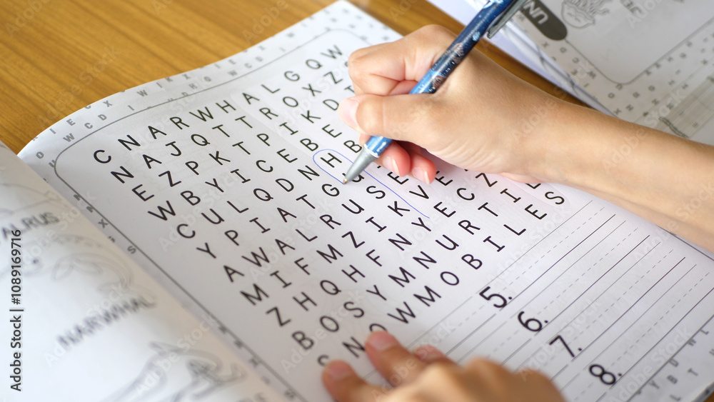 Close up of a kid solving a word search puzzle