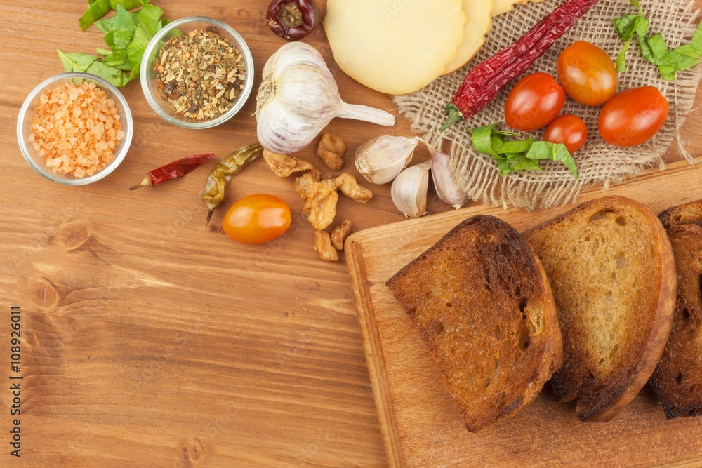 Fried bread with garlic and tomatoes. Toast to eat. Domestic food preparation. Quick to prepare meals for guests.