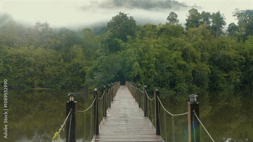 Scenic wooden bridge stretching across serene lake, surrounded by lush green forest and misty mountains in background, evoking tranquility and natural beauty. Nature and Serenity.