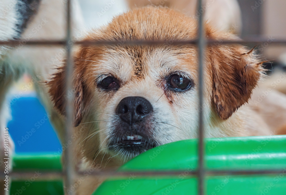 A hopeful shelter dog gazes through the bars of its kennel in a pet rescue facility looking for a loving forever home