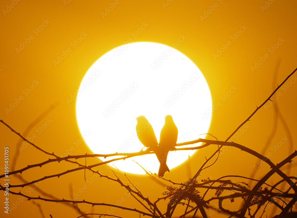 A pair of Grey Hypocolius and dramatic sun at Bahrain