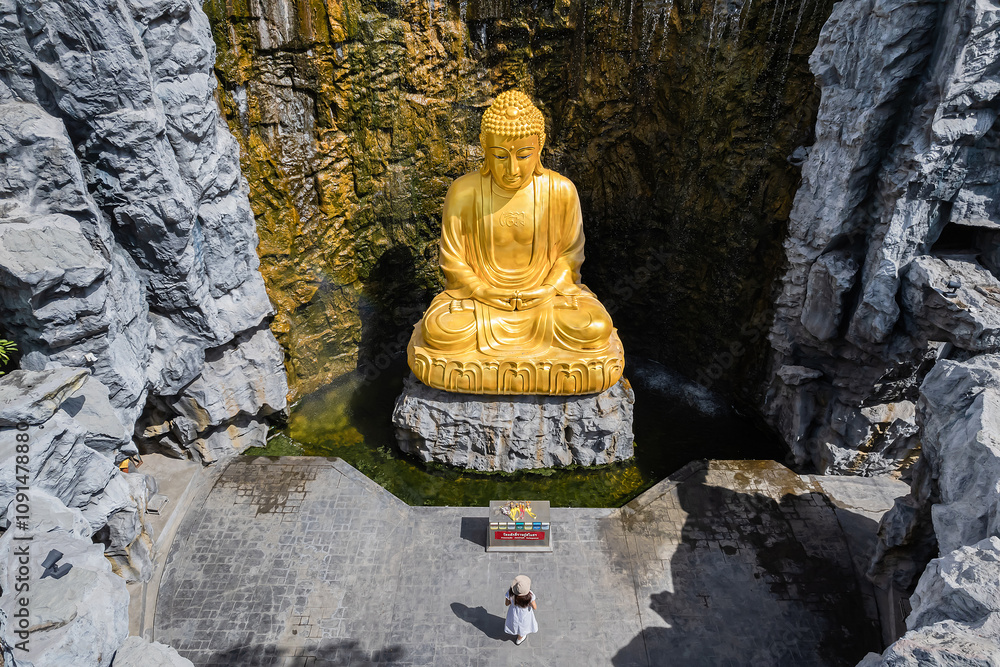 Beautiful aerial view of a golden Buddha statue with a young woman incense paying homage.