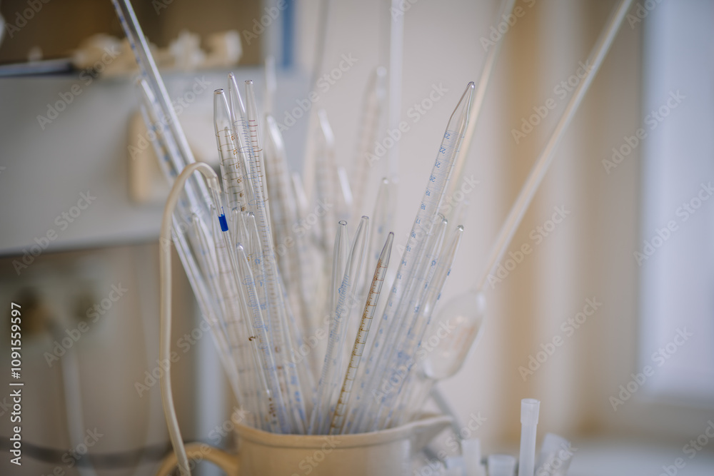 Close-up of laboratory glass pipettes in a container, used for precise measurement and transfer of liquids in scientific experiments.