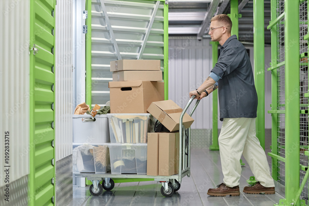 Full length shot of handsome man loading cart with cardboard boxes into self storage unit at warehouse while moving out or decluttering apartment