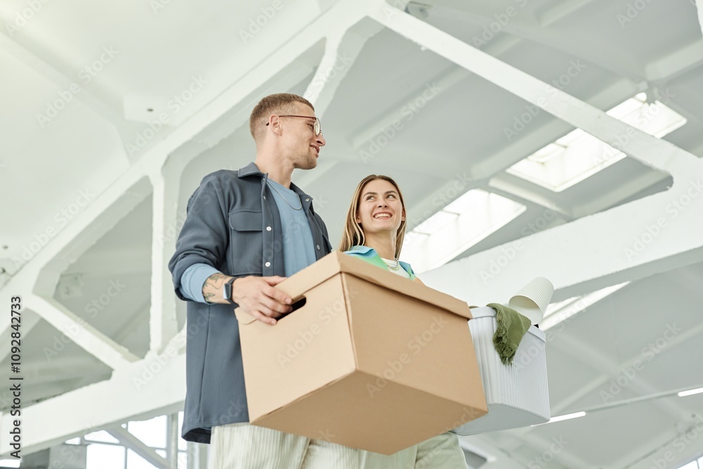 Low angle shot of two happy clients of self storage service carrying cardboard boxes into personal unit captured against high warehouse ceiling, copy space
