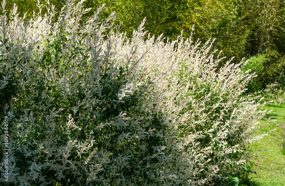 Willow whole-leafed Japanese, Salix integra Hakuro-Nishiki in spring Arboretum Park Southern Cultures in Sirius (Adler) Sochi. Natural white, pink foliage. Selective focus. Nature concept for design