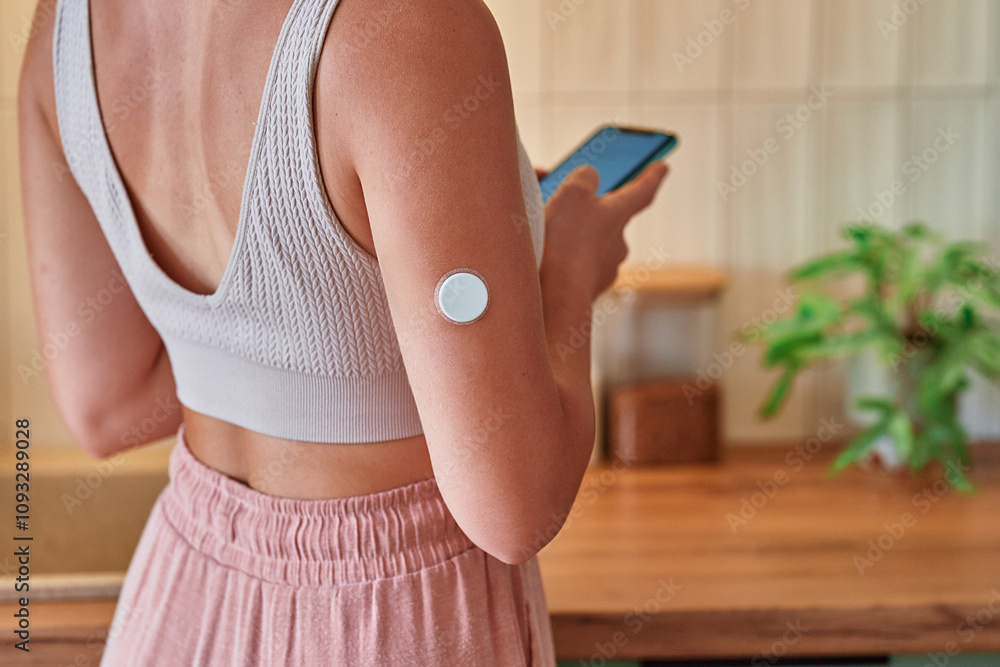 Young girl with diabetes uses smart remote sensor for monitoring of blood sugar level at home, modern active diabetic lifestyle