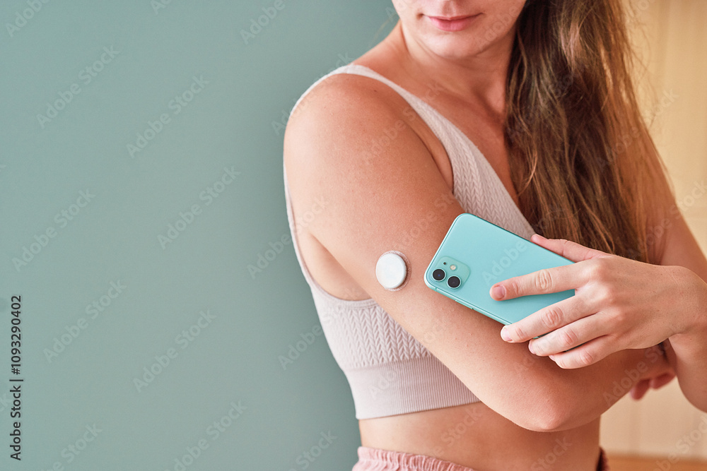 Young girl with diabetes uses smart remote sensor and smartphone for controlling and monitoring of blood sugar level at home, modern active diabetic lifestyle