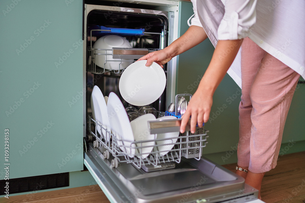 Housewife woman unloading dry clean shiny round white plates from modern dishwasher machine in the kitchen in Scandinavian style