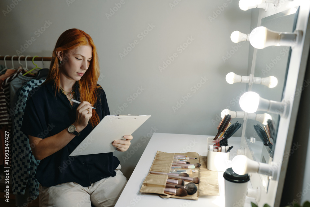 Female makeup artist sitting by illuminated vanity mirror, holding clipboard and examining work. Vanity table with makeup tools and brushes visible in modern salon