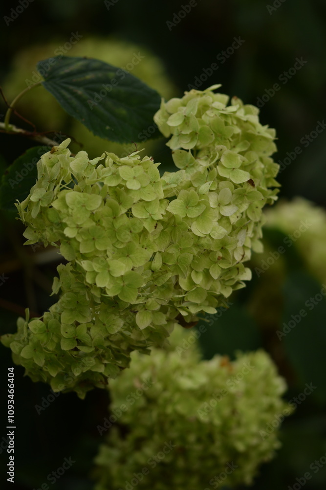 Blooming hydrangea lime green flowers closeup, slective focus, bokeh background.