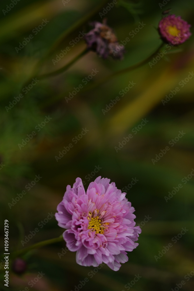 Pastel pink cosmos flowers "Double Click" on autumn garden background, selective focus, bokeh.