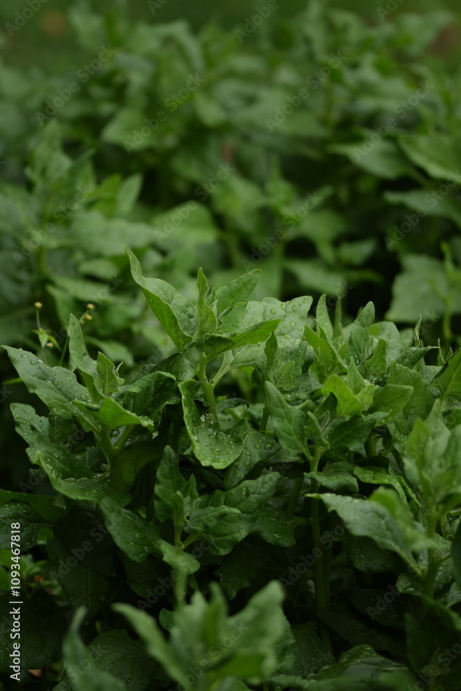 New Zealand spinach plant closeup, spinach green leaves closeup, selective focus, spinach background or texture,, heirloom plant.