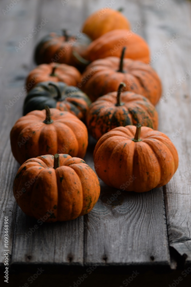 Ornamental pumpkins Sweetie Pie on old wooden background, autumn background with pumpkins, selective focus, blurred background, vertical.