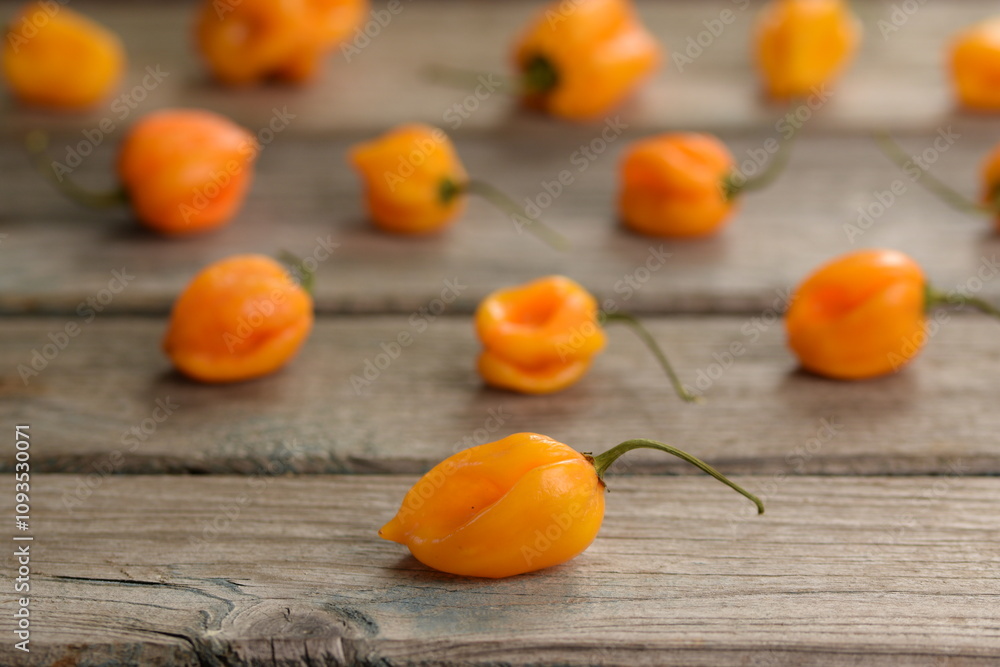 Yellow Habanero peppers on wooden background, Habanero Limon, selective focus, bokeh, red habanero background, pepper background, space for text, copy space.
