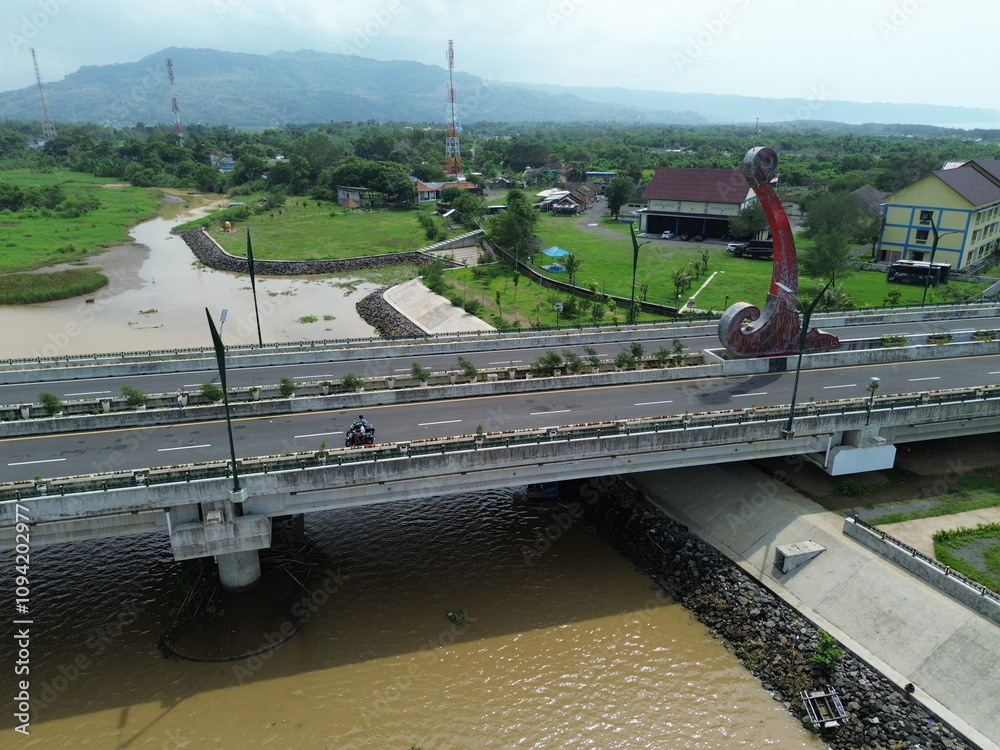 Aerial photograph showing a highway bridge spanning a wide river, surrounded by lush green landscape. The scene captures modern infrastructure harmonizing with nature.
