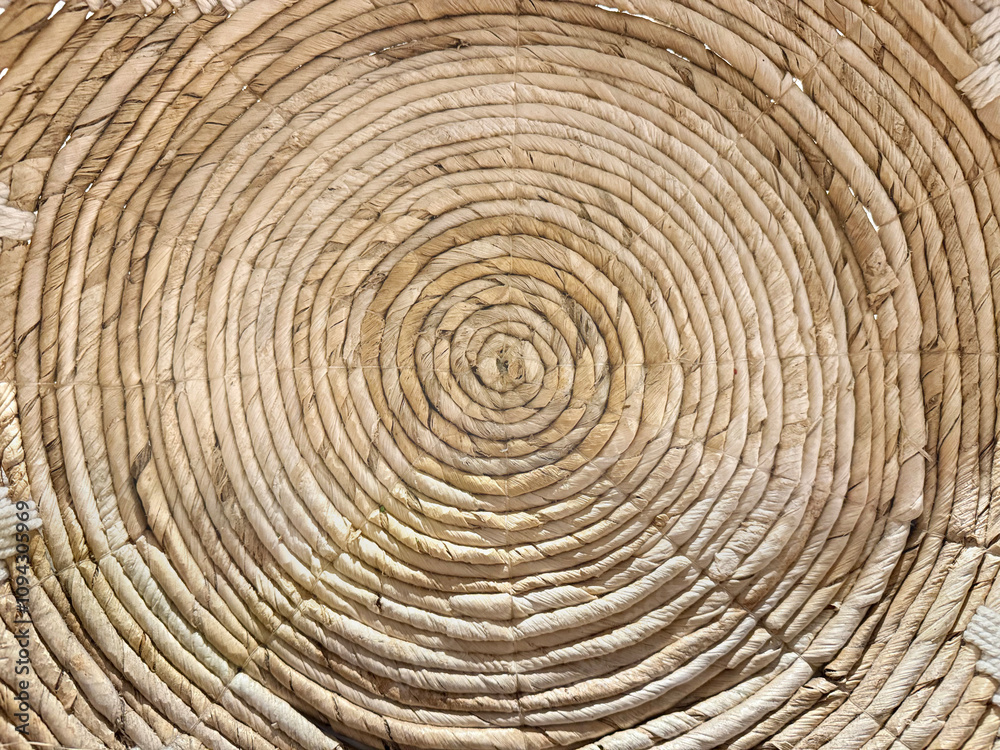 Random spiral rattan or wicker art and craft, round circle spiral synthetic rattan basket weave accessories or decoration on wall.